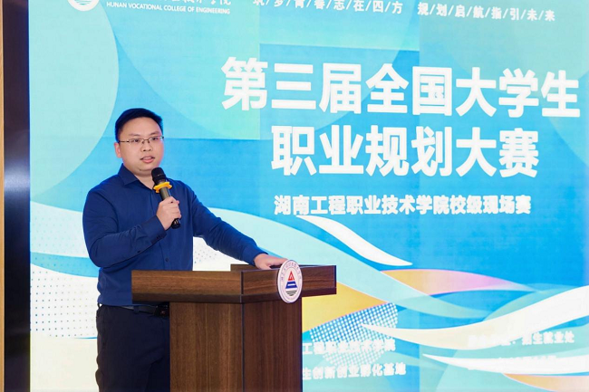 比赛邀请阿里巴巴全球数字人才教育联盟秘书长王振彬、万学教育集团湖南分公司总经理李元基、楚天科技人力资源经理唐美强、湖南农业大学就业创业教研室主任邓艳、湖南工商大学招生就业处副处长曹东担任评委。经过二级学院选拔、校级复赛,20名优秀选手脱颖而出,会师校级现场赛,比赛现场吸引了来自不同专业百余名师生生观摩、学习。